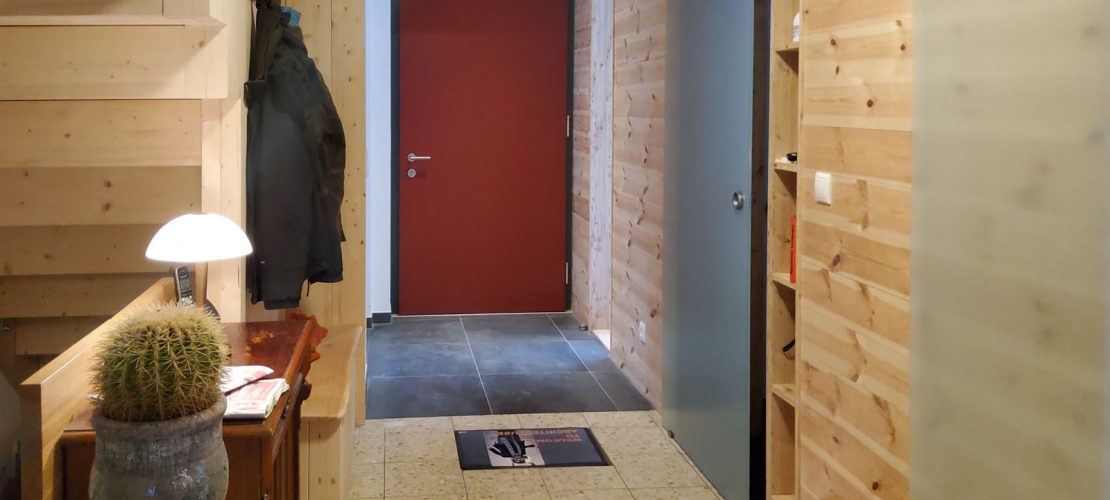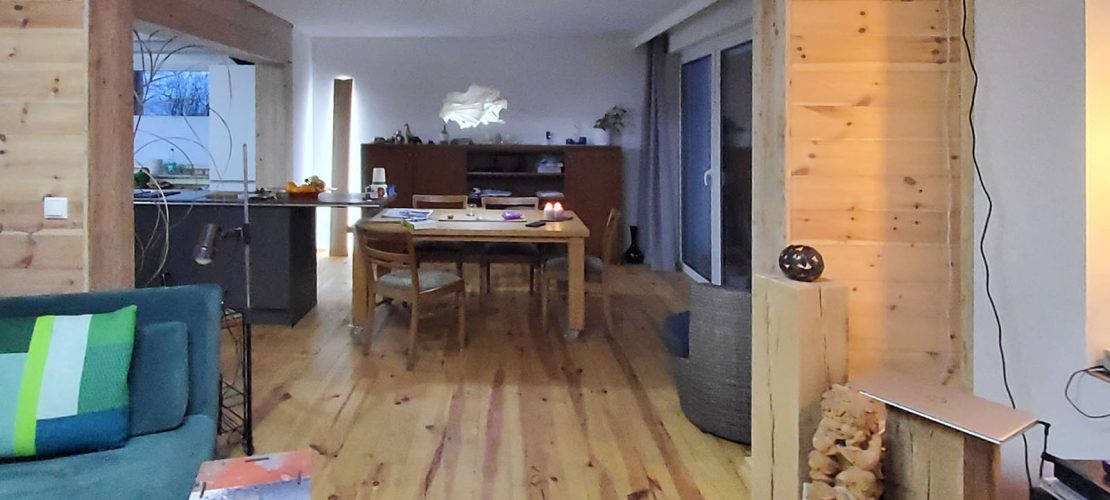Durchgängige Bodenbelege, schwellenfreie Austritte, rollstuhlfreundliche Schiebetüren, stilvolle Geländer und ein SmartHome-System sorgen dafür, dass die Wohnqualität auch für Personen mit Bewegungseinschränkungen gegeben ist. Im Verlauf des Umbaus wurde zudem die gesamte Haustechnik erneuert. Für eine ökologische Wärmeproduktion sorgt nun eine Luft-Wasser-Wärmepumpe unterstützt von einer noch intakten Ölheizung, die zukünftig nur noch einen kleinen Teil ihrer bisherigen Leistung zur Verfügung stellen muss, nach ersten Erfahrungen aber wohl gar nicht mehr benötigt wird. Dank einer PV-Anlage mit Batteriespeicher kommt ein wesentlicher Teil des benötigten Stroms aus eigener Herstellung.