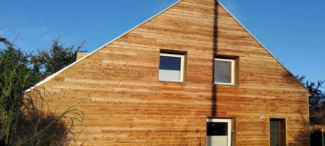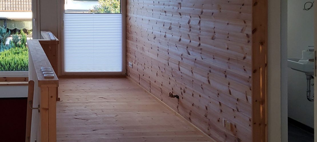 Bauherrn wie Architektin war dabei auch wichtig, den Umbau so nachhaltig wie möglich zu gestalten. Dazu gehörte, die graue Energie des Altbaus, die ja bereits während der ersten Bauphase aufgewendet wurde, zu erhalten und die alte Gebäudehülle in das Konzept zu integrieren. Dabei sollten aber trotzdem ein zeitgemäßer energetischer Standard und eine hohe Wohnqualität geschaffen werden. Unter Einbeziehung einer Energieberatungsagentur konnten die Dämmmaßnahmen so optimiert werden, dass das Gebäude nun einem KfW 70 Haus entspricht. Gedämmt wurde mit 16 Zentimeter starken Holzweichfaserplatten. Statt der gewohnten Klinkerfassade sorgt jetzt eine Stülpschalung aus Lärchenholz für eine ansprechende Optik. Dadurch steckt nun ein Haus im Haus. Statt Dachüberstand und auskragendem Balkon unterstreicht ein innenliegendes Satteldach zusätzlich das äußere Erscheinungsbild.